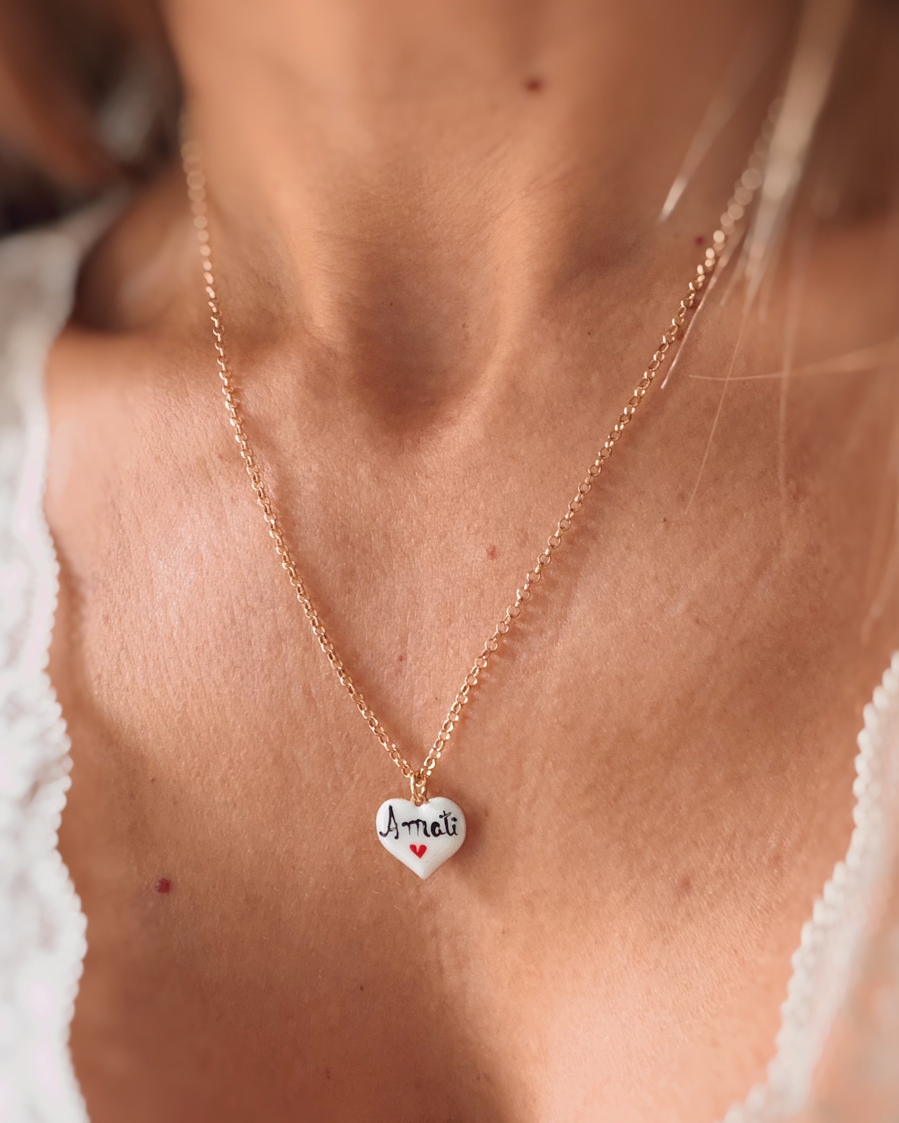 Collana modello rollò in argento 925 con ciondolo a forma di cuore pendente di circa 1,5cm con scritta “amati” su un lato e un cuoricino rosso sull’altro