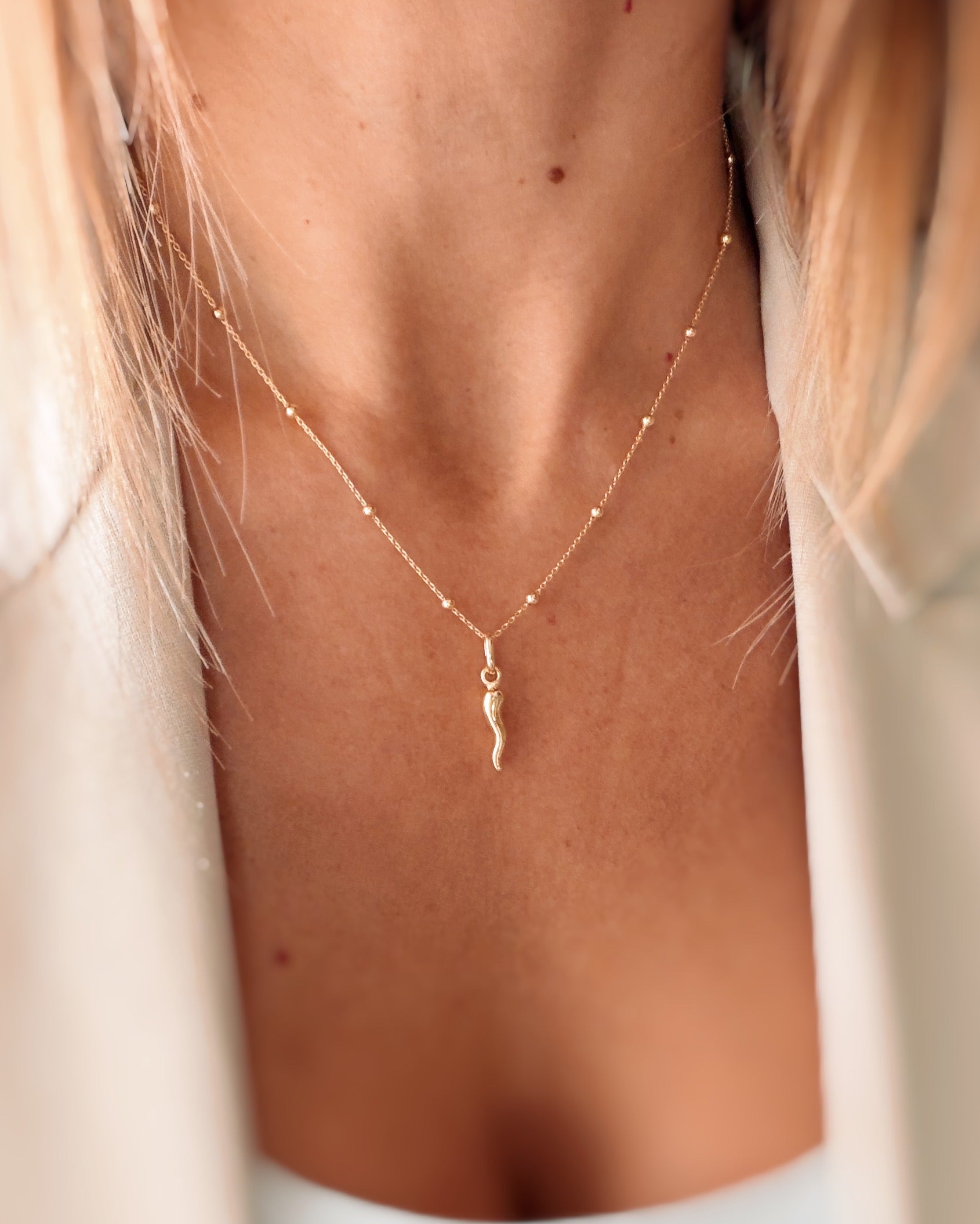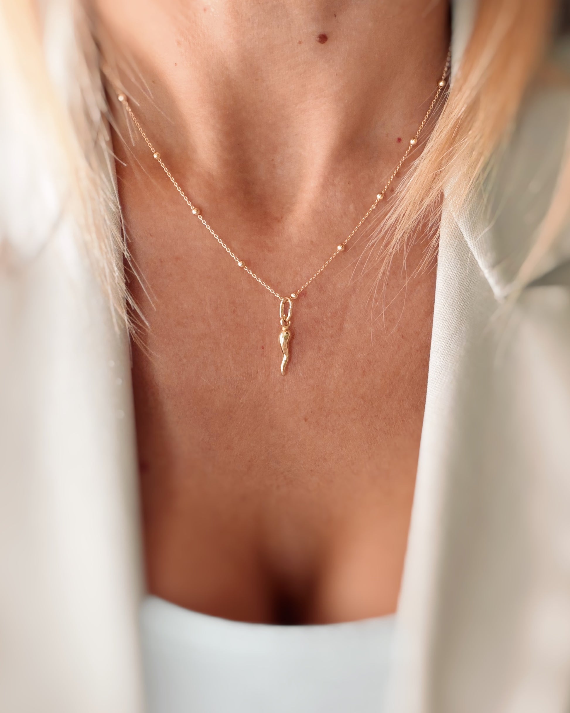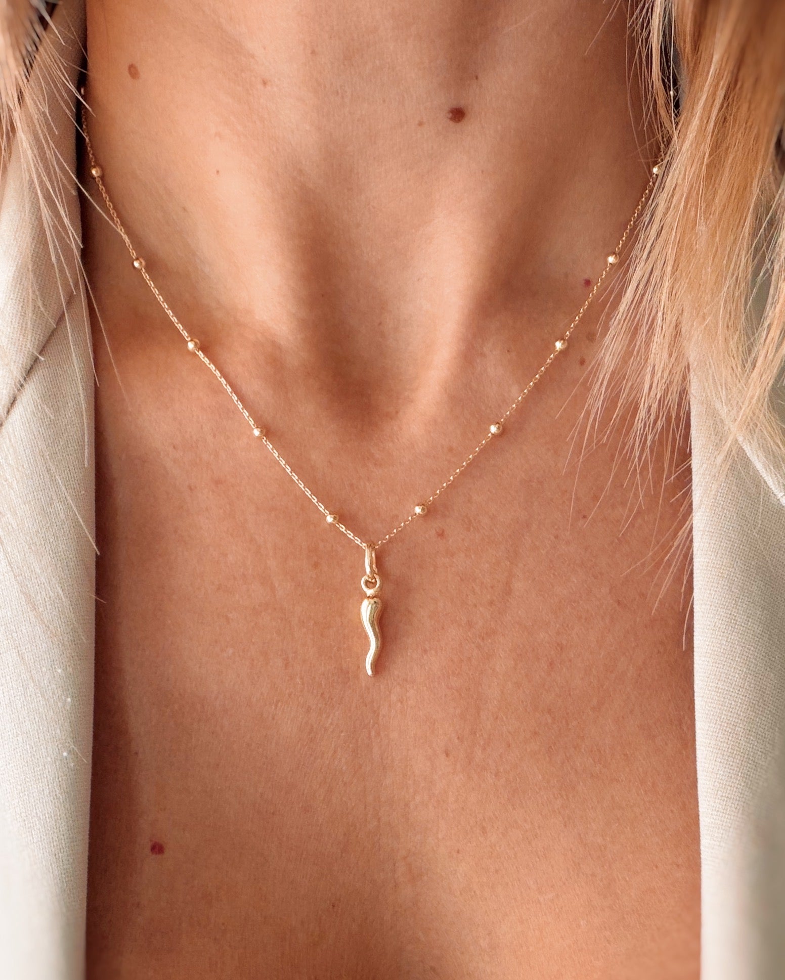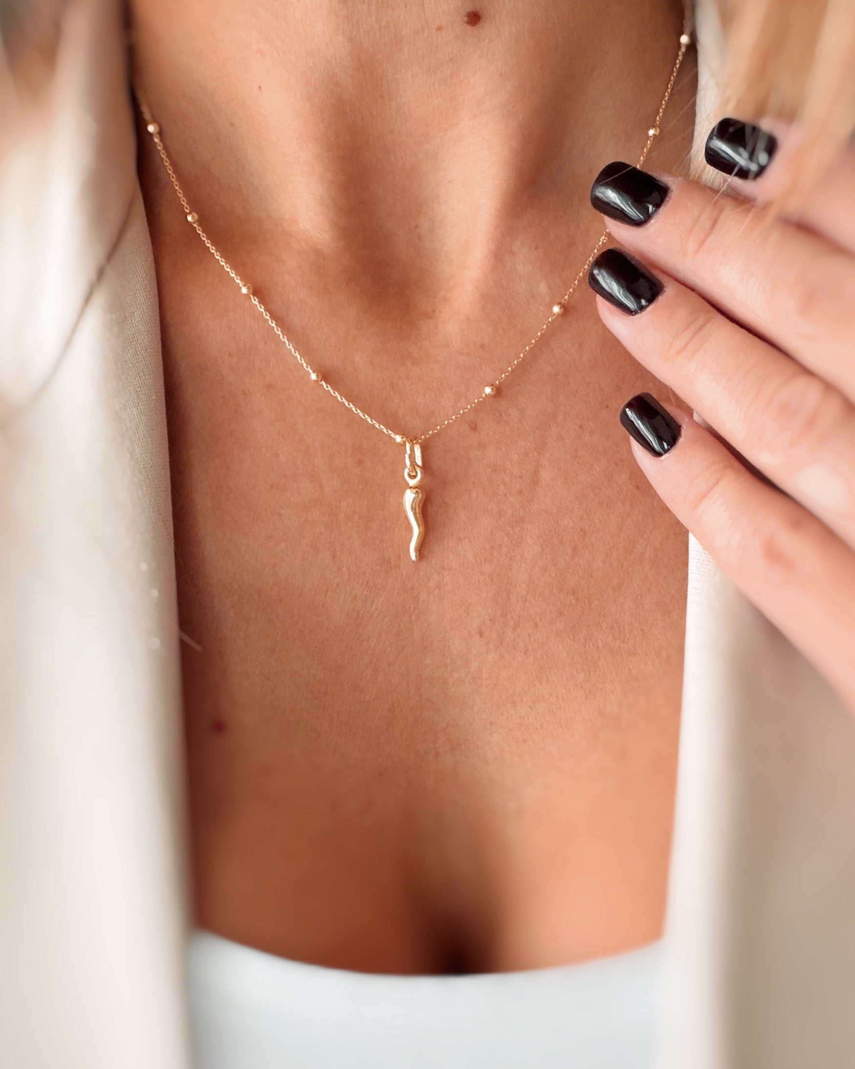 Collana tramezzata in argento 925 e cornetto portafortuna.