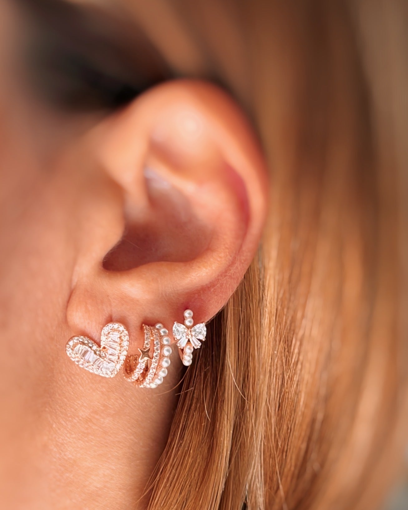 Coppia di orecchini in argento 925 a forma di cuore con zirconi taglio baguette.