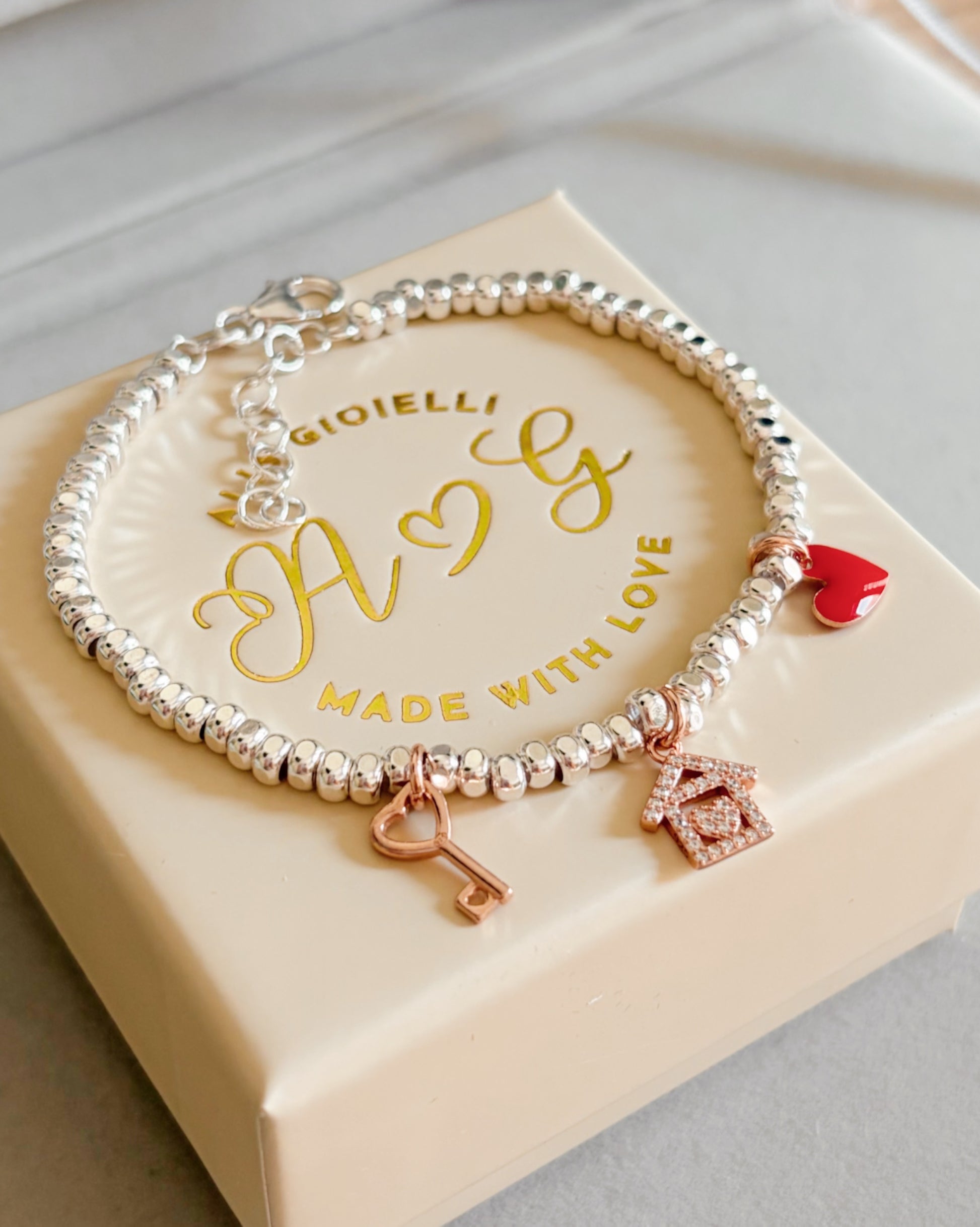 Bracciale con rondelle sfaccettate in argento 925 bianco con charms pendenti: mini casetta zirconata, mini chiave dell’amore e mini cuore smaltato rosso