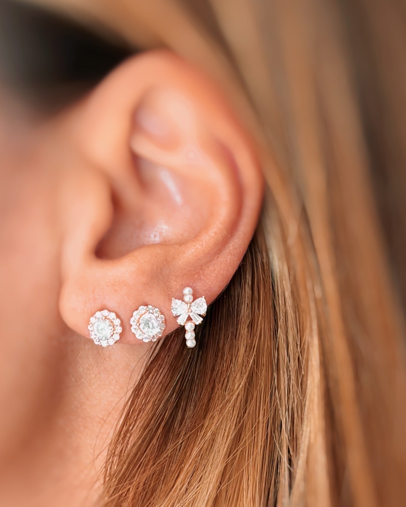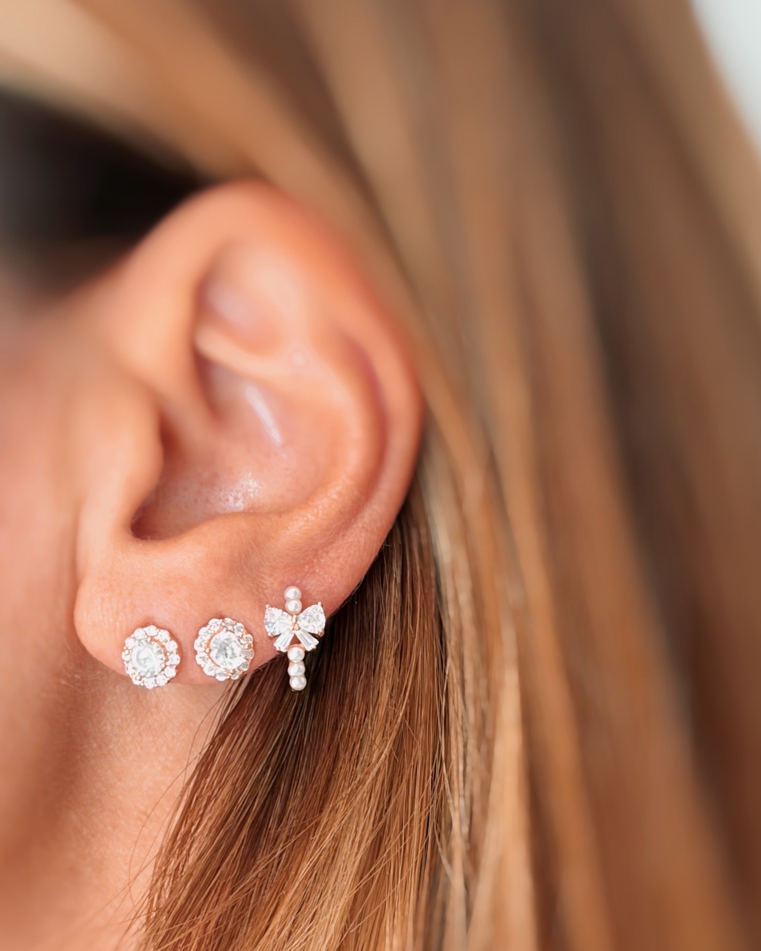 Coppia di cerchietti in argento 925 con fiocchetto zirconato e fila di perle con galvanica in oro rosa