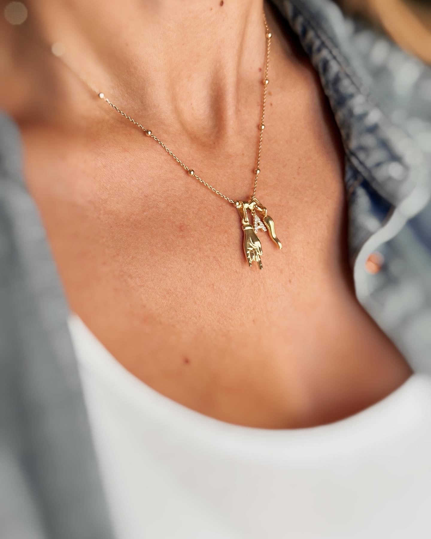 Collana tramezzata in argento 925 con iniziale in zirconi e cornetto portafortuna e manina con corna