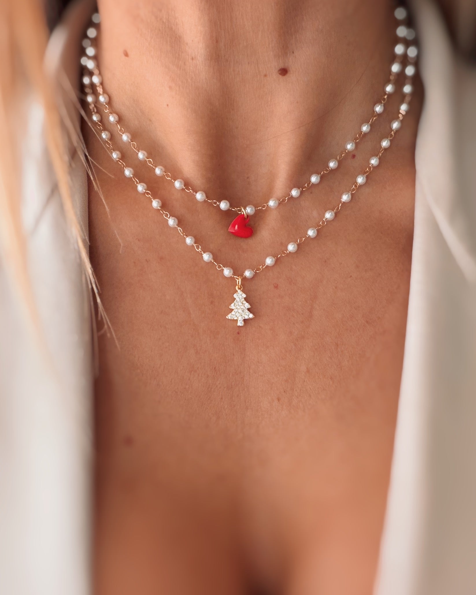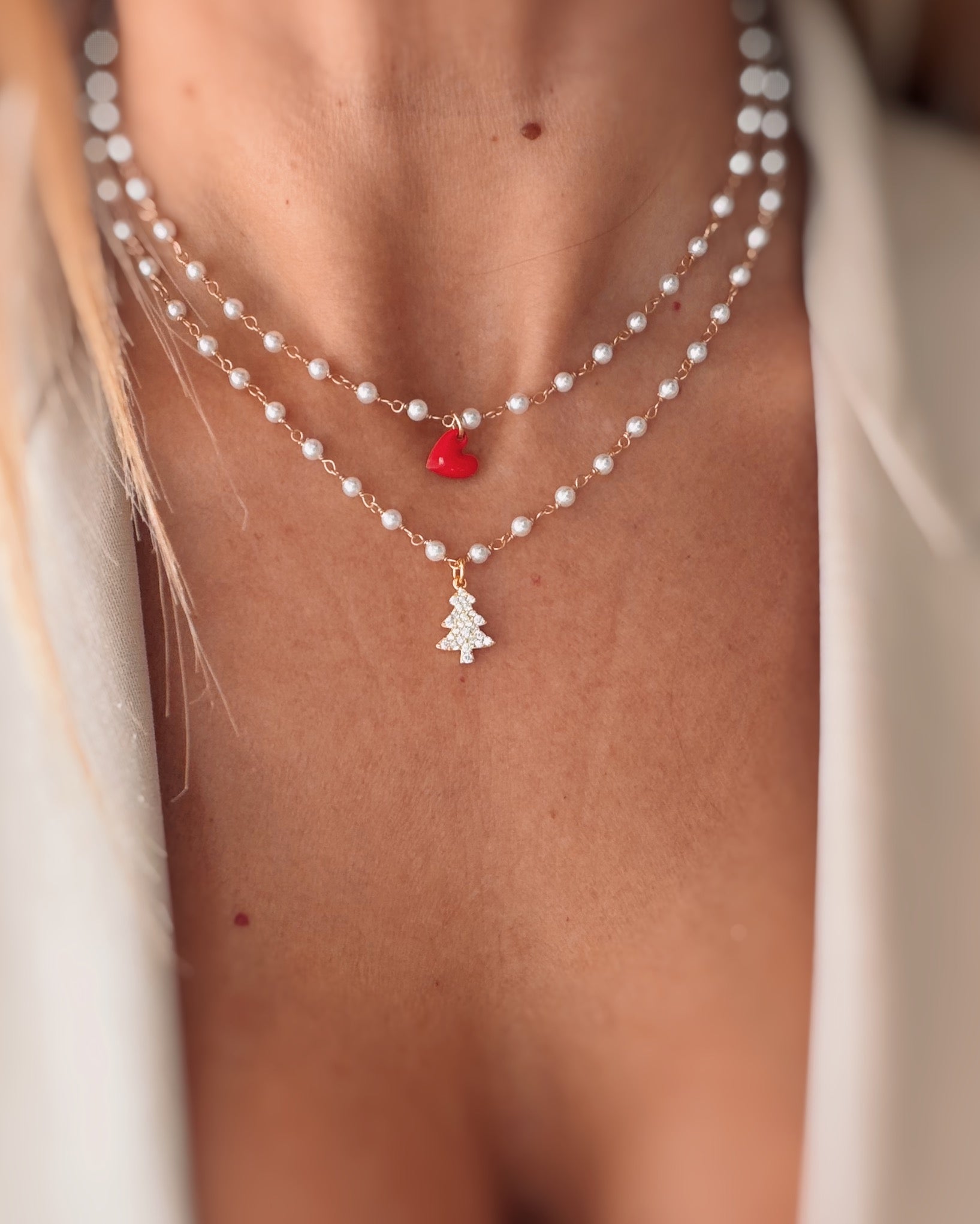 Girocollo in argento 925 con galvanica in oro giallo e perle e pendete albero di Natale in zirconi bianchi