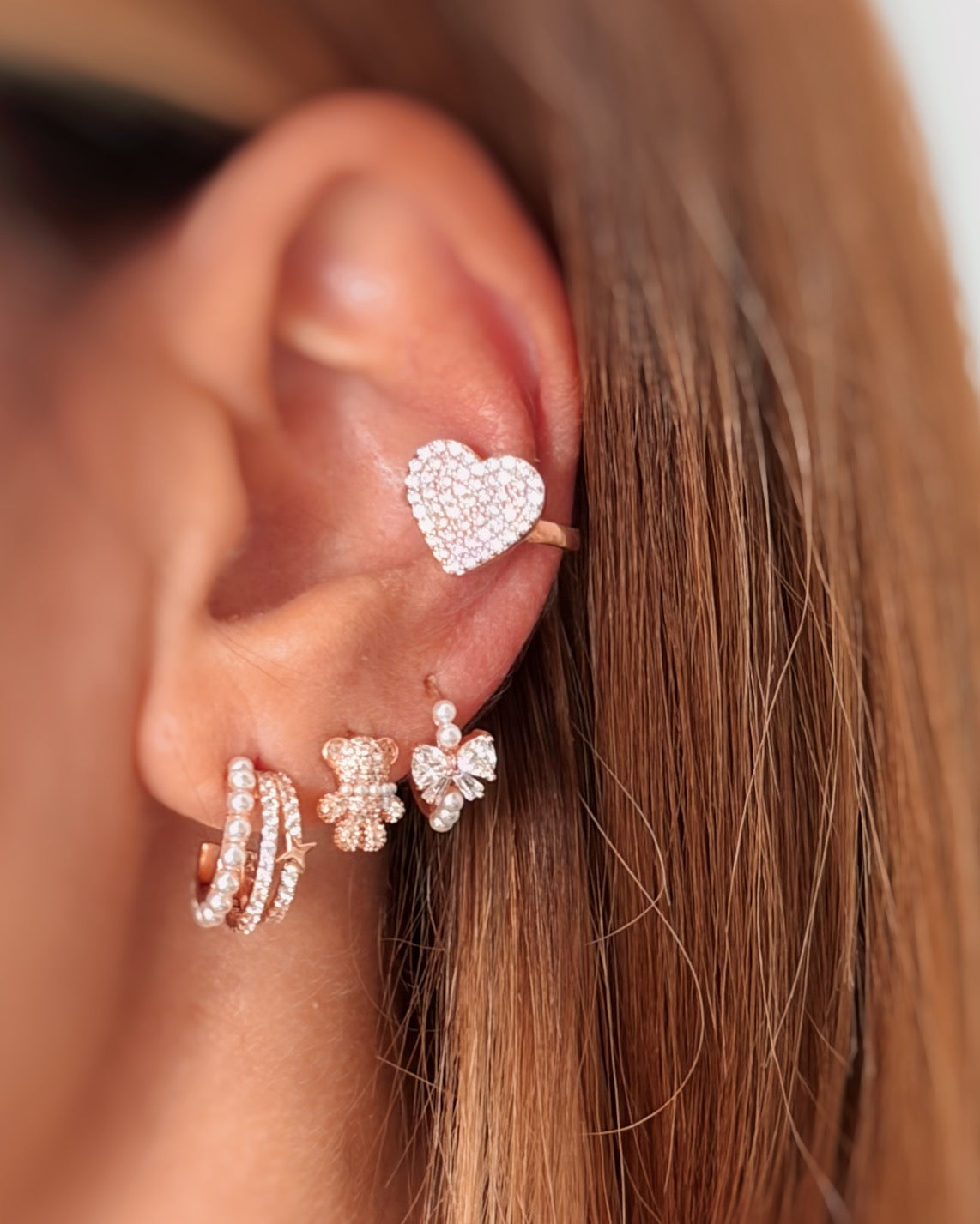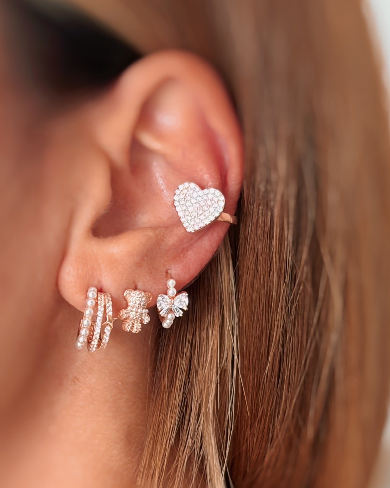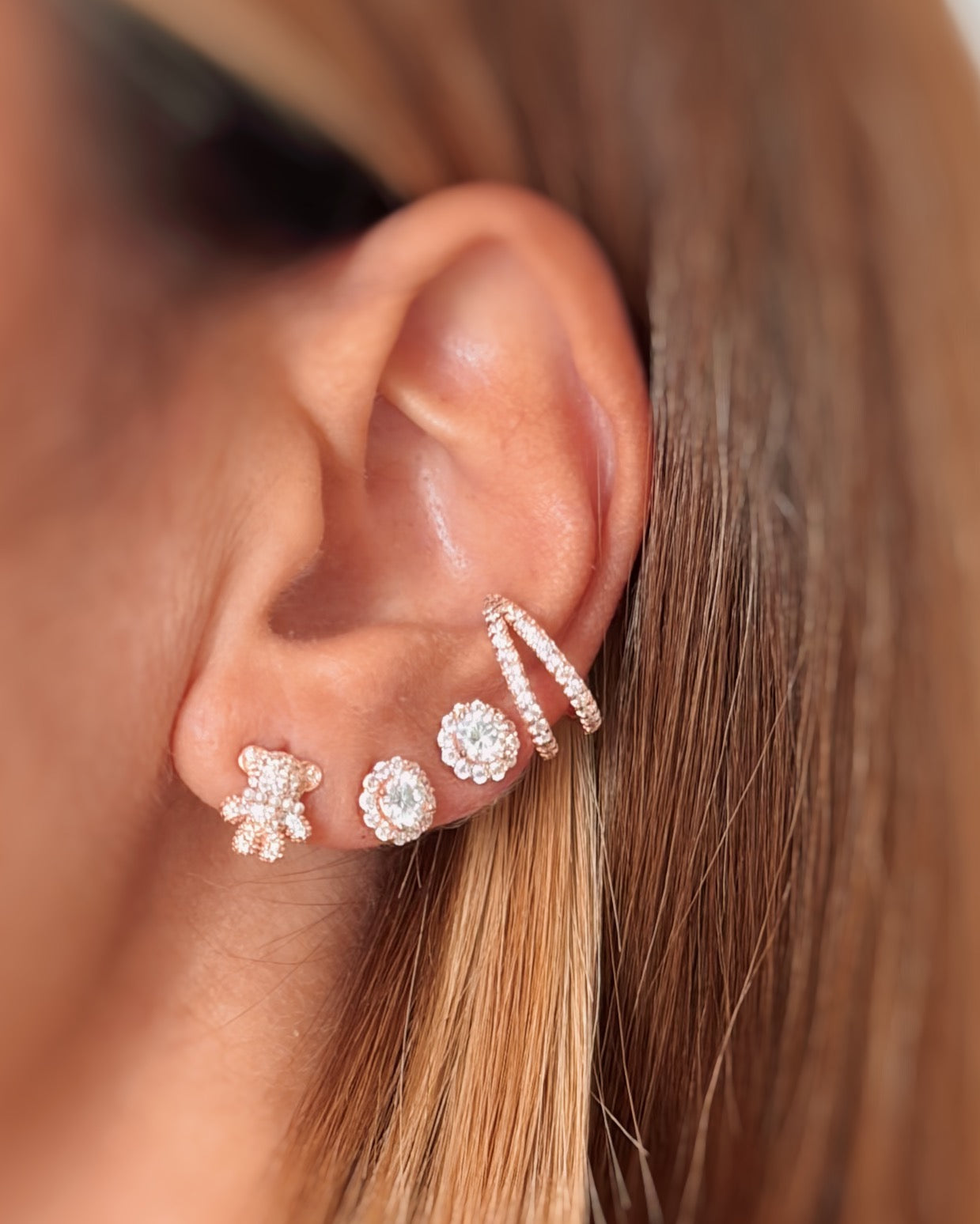 Coppia di orecchini a forma di orsetto in argento 925 con galvanica in oro rosa, zirconi bianchi e mini perline